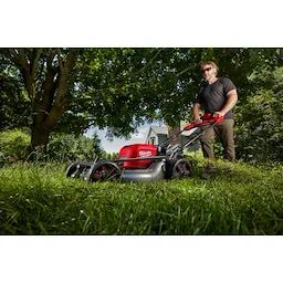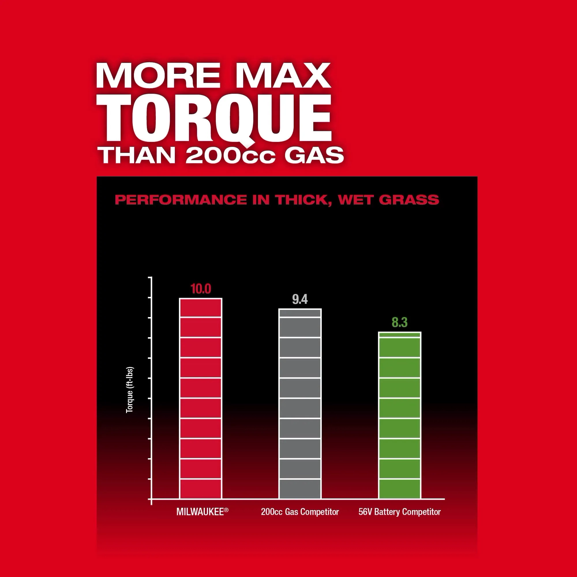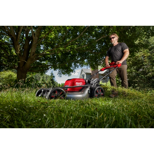 Our M18 FUEL™ 21" Self-Propelled Dual Battery Mower Kit meets the performance, durability, and ergonomic needs of landscape maintenance professionals. The optimized steel deck design paired with higher blade speed allows our cordless electric lawn mower to achieve superior airflow and increased lift to deliver the best cut quality in mulching, bagging, and side discharge applications. The POWERSTATE™ Brushless Motor delivers more max torque than 200cc gas to take on the most demanding mowing applications. The REDLINK PLUS™ Intelligence has total system communication between the tool and battery for unmatched levels of performance, protection, and productivity. The advanced electronic package also delivers an instant throttle response on both the blade and drive motors to reach full throttle in under 1 second, which increases your control and productivity. The electric mower requires 2 M18™ REDLITHIUM™ Batteries for operation. When paired with the included 2 M18™ REDLITHIUM™ FORGE™ HD12.0 batteries, the self-propelled electric lawn mower delivers up to 60 minutes of runtime, allowing up to 1/2 acre of cutting when removing 1" of grass at a 3 MPH self-propelled pace. The Variable Speed Self-Propelled Mower offers speeds between 0 - 4 MPH, and the Active Speed Management Paddles allow you to easily adjust your walking pace while in operation to increase control. The M18 FUEL™ Mower features a steel deck, 3-in-1 grass management, single point height adjustment, high lift mode, front & side LED lights, vertical storage, and two deck handles. The M18 FUEL™ 21" Self-Propelled Dual Battery Mower is part of the M18™ System, fully compatible with over 200 solutions.