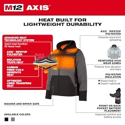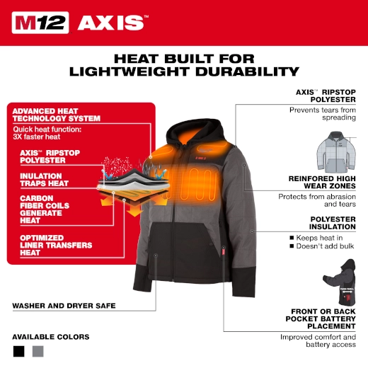Notre veste chauffante M12MC AXISMC offre une chaleur conçue pour être légère et durable. Alimentée par la technologie de batterie M12MC REDLITHIUMMC, cette veste à capuchon à trois panneaux est dotée d’un système de technologie thermique avancé utilisant des éléments chauffants en fibre de carbone et la fonctionnalité Quick-Heat, distribuant la chaleur 3X plus rapidement que les concurrents du marché au niveau de la poitrine, du dos et des épaules. La construction d’une poche passe-partout cachée pour la batterie permet de placer la batterie à l’avant ou à l’arrière, ce qui augmente le confort et la flexibilité en fonction de la situation. Grâce au tissu polyester AXISMC Ripstop remanié, cette veste MILWAUKEEMD protège nos utilisateurs de l’abrasion et empêche les déchirures de se propager dans des conditions de travail difficiles.