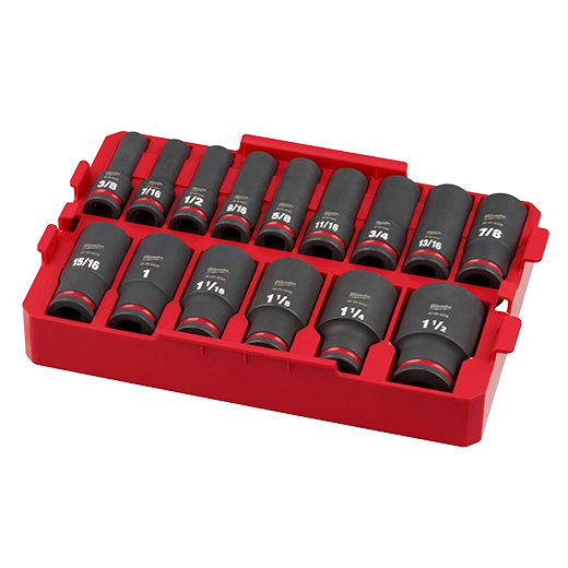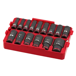 Le kit comprend 15 douilles SAE profondes Contient les tailles suivantes : 3/8 po, 7/16 po 1/2 po, 9/16 po, 5/8 po, 11/16 po, 3/4 po, 13/16 po, 7/8 po, 15/16 po, 1 po, 1-1/16 po, 1-1/8 po, 1-1/4 po, 1-1/2 po