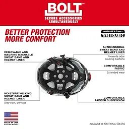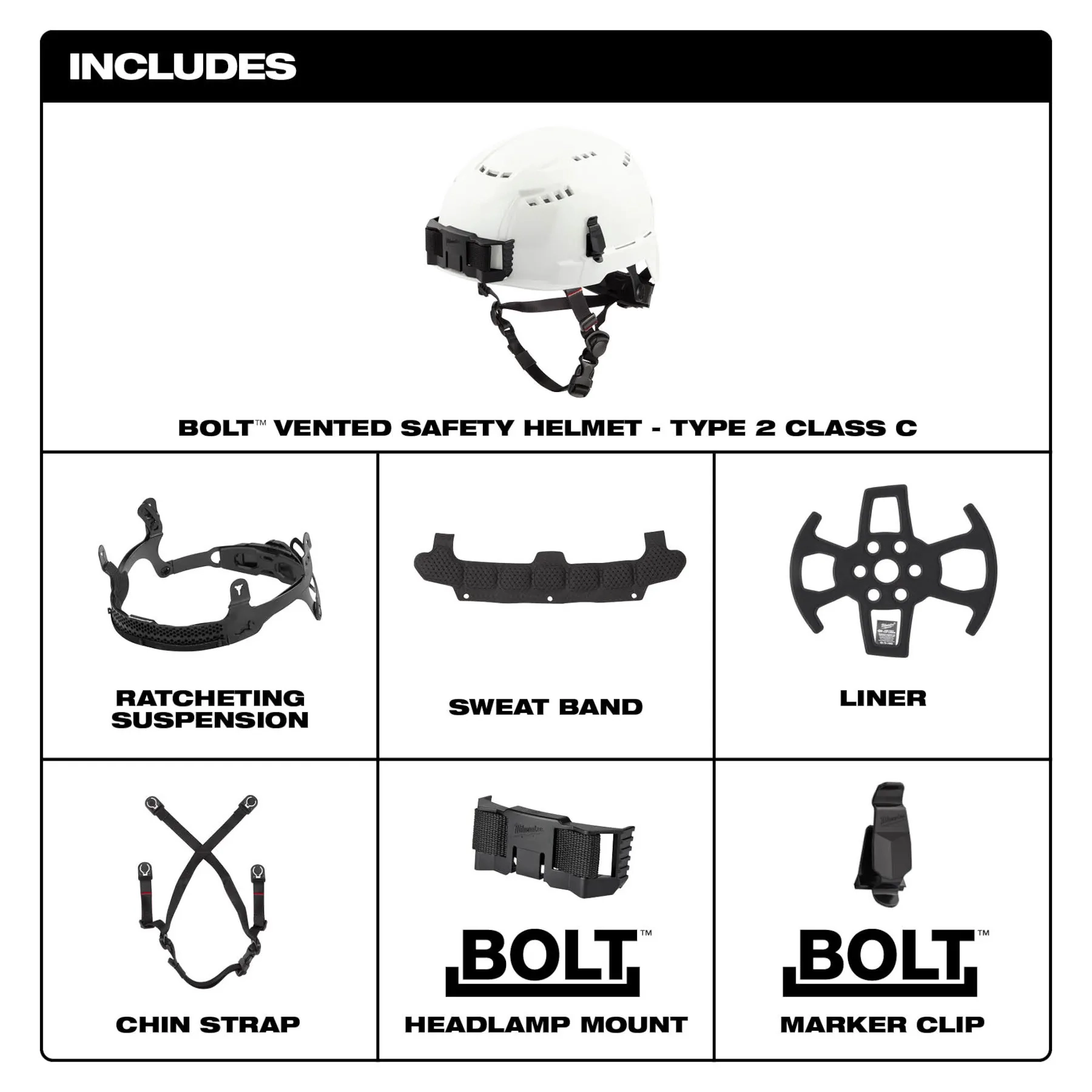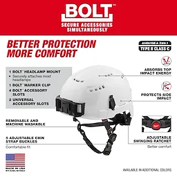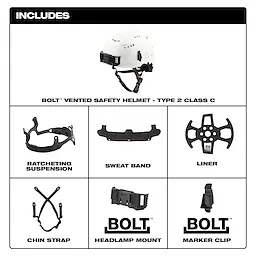 Nos casques de protection éventés type 2, classe C vous offrent une meilleure protection et plus de confort. Ces casques de protection offrent une protection contre les chocs sur le dessus et les côtés. Ces casques de protection pour la construction comptent quatre fentes d’accessoires BOLTMC et deux fentes d’accessoires universelles qui permettent d’intégrer d’autres équipements de protection individuelle et accessoires afin de vous adapter à votre milieu de travail. Ces casques comprennent une monture de lampe frontale MILWAUKEEMD BOLTMC compatible avec la plupart des lampes frontales pour l’installation simple et solide, et une pince à crayon BOLTMC pour l’accès facile aux stylos et marqueurs. Ce casque Milwaukee est muni d’une confortable suspension matelassée comprenant un cliquet pivotant pour un confort accru. Ce casque genre alpiniste possède également une mentonnière à cinq boucles de réglage confortable pour une sécurité accrue. Le bandeau absorbant et la doublure de casque antimicrobiens préviennent la formation d’odeurs et de bactéries et sont amovibles pour être lessivés. Ces casques de protection sont homologués ANSI type 2 et sont personnalisables avec votre propre logo.