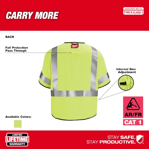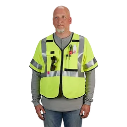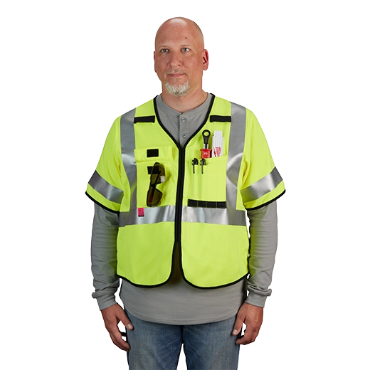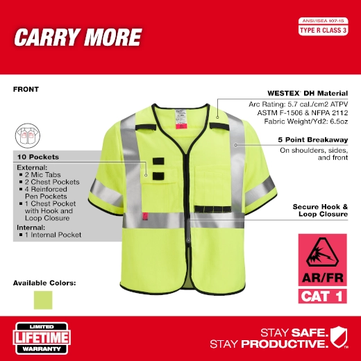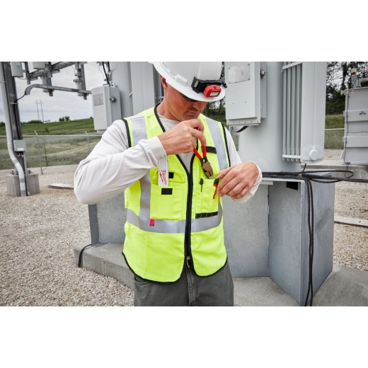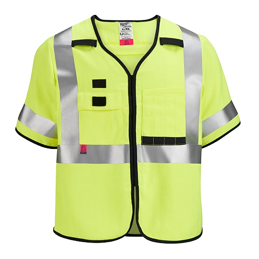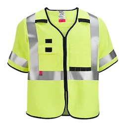 Nos gilets de sécurité à haute visibilité résistants aux arcs électriques/ignifugés Cat. 1 Classe 3 sont conçus pour transporter plus. Ce gilet résistant aux arcs électriques et ignifugé est muni de 10 poches, incluant des poches de stylo, une poche de poitrine avec fermoir et une poche intérieure pour l’accès facile à des articles essentiels lorsque vous êtes au travail. Tissu résistant aux arcs électriques/ignifugé WESTEXMD DH par MilikenMD DH procurant un confort supplémentaire lorsque vous portez le gilet dans le cadre d’un système complet de vêtements résistants aux arcs électriques et au feu avec une cote ATPV de 5,7 cal./cm². Le gilet de sécurité jaune est doté d’un système d’ajustement interne offrant un meilleur ajustement et une fente renforcée pour le passage d’un dispositif antichute. Ces gilets sont conformes à NFPA 2112 pour la protection contre les incendies éclairs et les éclairs d’arc électrique. Les gilets de sécurité à haute visibilité de classe 3 sont recommandés pour les professionnels travaillant dans des environnements exigeant une visibilité accrue, où la circulation dépasse 80 km/h (50 mi/h) et autour de machinerie lourde. Les gilets de sécurité MILWAUKEEMD résistants aux arcs électriques/ignifugés Cat.1 classe 3 sont conformes à ANSI.