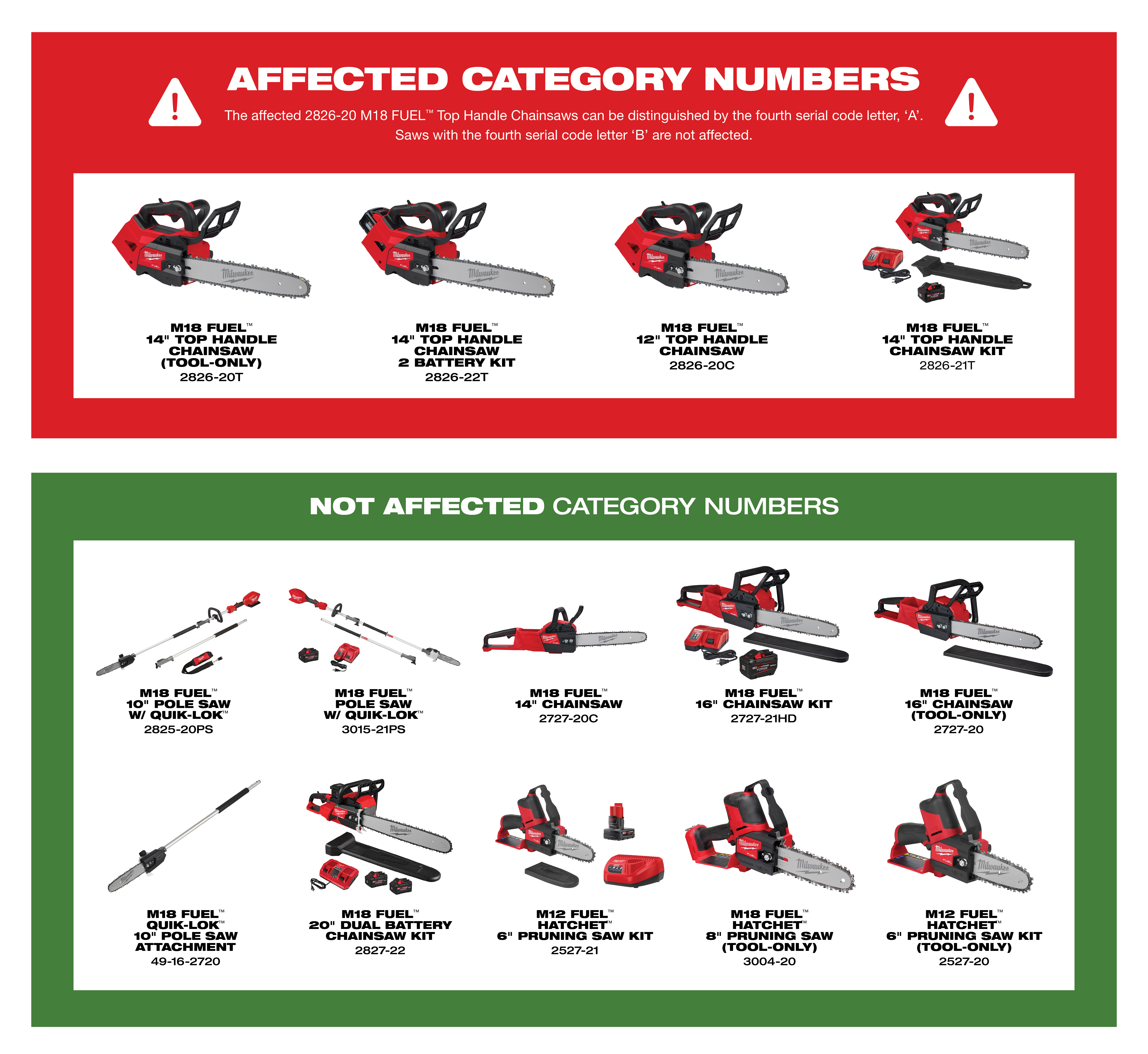 · The only affected saw is the M18 FUEL™ Top Handle Chainsaw