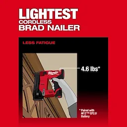 Our M12 FUEL™ 18 Gauge Compact Brad Nailer delivers peak productivity at the jobsite, providing users with unmatched nailing performance & access to tight spaces with the compact, lightweight, ergonomic design. Leveraging a nitrogen air spring mechanism, this brad nailer enables our users to sink 5/8” – 1-½” brad nails to the proper depth in both hard and soft materials while leaving clean, consistent nail holes. Because of the compact design, our M12 FUEL™ 18 Gauge Compact Brad Nailer delivers the most access of any cordless brad nailer in the lightest weight design at only 4.6lbs when paired with our M12 REDLITHIUM™ 2.0 battery. When paired with an M12™ CP2.0 Battery, the M12 FUEL™ 18 Gauge Compact Brad Nailer provides over 700 nail fires on a single battery charge. For additional run time, the M12 FUEL™ 18 Gauge Compact Brad Nailer is fully compatible with all Milwaukee® M12™ REDLITHIUM™ Batteries.