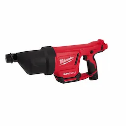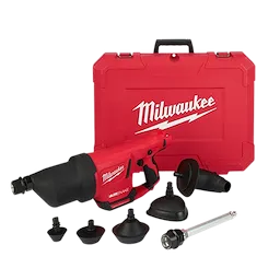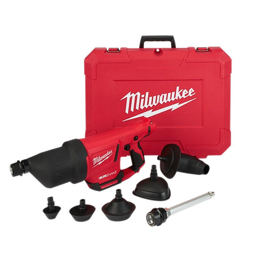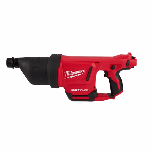 Our M12™ AIRSNAKE™ Drain Cleaning Air Gun is the industry's only drain cleaning machine designed to clear through drain covers and traps with powered air. The cordless air gun allows you to clear clogged drains while leaving fixtures and drain covers intact. The tool is designed for 1"-4" drain lines and has the power to clear up to 35 ft. past vent stacks and tees. The drain cleaning air gun has a variable pressure dial giving you complete control when working on delicate pipe systems. Powered air flushes water out of pipes, completely removing grease and sludge from pipe walls. Drain professionals, plumbers, and facility maintenance crews will be able to work faster when clearing clogs with the ability to work over sinks and eliminate retrieval mess. The MILWAUKEE® M12™ AIRSNAKE™ is powered by our M12™ REDLITHIUM™ battery packs, delivering you with more work per charge and more work over pack life. Built-in REDLINK™ Intelligence provides you with optimized performance and overload protection against abusive situations. In addition to the air gun, this products comes with (3) Drain Plug Attachments, (1) Drain Shroud Attachment, (1) 15 Degree Connector, (3) Straight Connector, (1) Toilet Seal Attachment, (1) 10" Extension, and (1) Carrying Case.