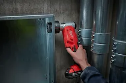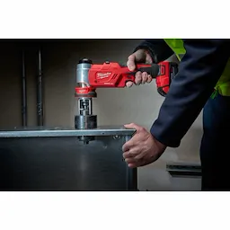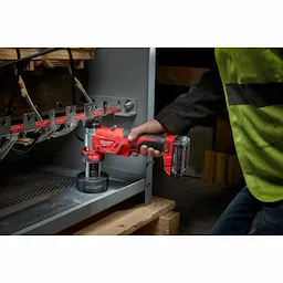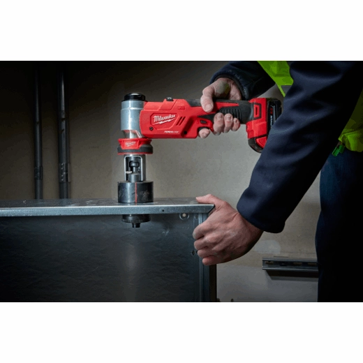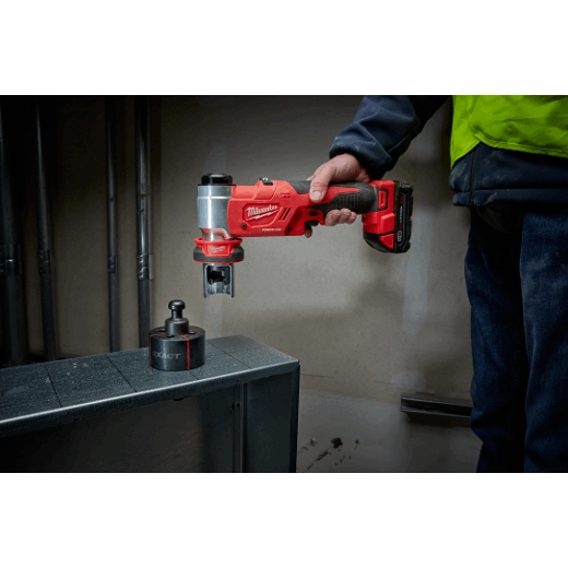 Our M18™ FORCE LOGIC™ 6 Ton Knockout Tool Kit reduces the tedious steps of hole making, improving your speed and limiting your fatigue. This knockout punch tool is specifically designed to be the ideal mild steel punching tool. It is powerful enough to punch up to 4” holes in 14 gauge mild steel. It is also 40% lighter weight than other 6T knockouts available. The electrical knockout tool has a compact, right angle design that delivers you the best clearance in tight spaces. Our Quick Connect Alignment System provides you with easy set-up without the weight of the tool and speeds up repetitive punching. The tool is compatible with all our MILWAUKEE® EXACT™ punches and dies. The knockout dies are rated for both mild and stainless steel punching. Vivid red cross hairs provide you with accurate alignment and slug removal ports provide optimal slug removal. The gripping surface on the EXACT™ punches allows you to thread faster. The cordless 6-ton knockout tool delivers the Easiest Way to Punch.