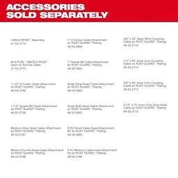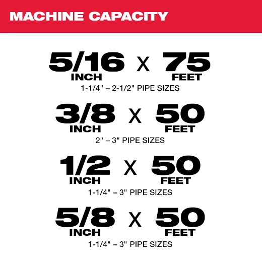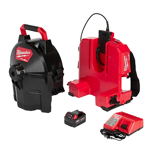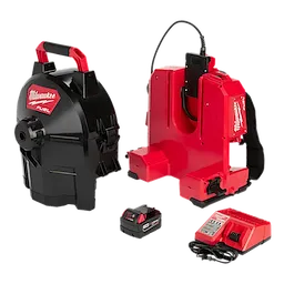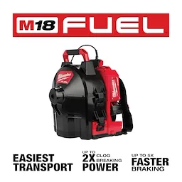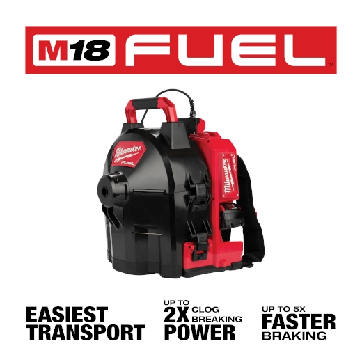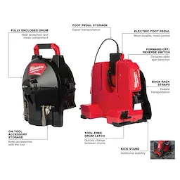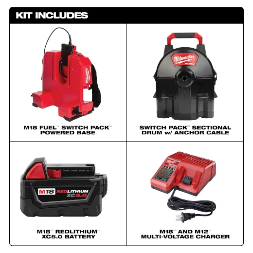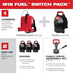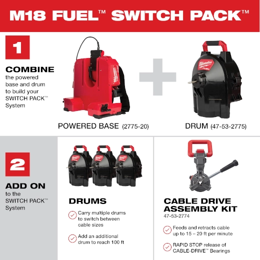 Our M18 FUEL™ SWITCH PACK™ Sectional Drum System 5/16" Kit is the first drain cleaning solution that combines the benefits of sectional and drum machines, creating the single most versatile and mobile machine on the market. The drain cleaning machine allows you to tackle the most frequent challenge of any drain cleaning application - getting the machine onto the job. The SWITCH PACK™ System utilizes a modular design with backpack straps allowing you to easily transport it to any roof, drain, crawl space or cleanout. The tool-free drum connection allows you to quickly switch between cable sizes or add a second drum, allowing you to reach 100' down the line. All MILWAUKEE® SWITCH PACK™ drain cleaning drums are fully enclosed providing you with the best protection against job site mess. The POWERSTATE™ Brushless Motor provides you with more clearing power than corded units for tough jobs in up to 4" drain lines. Built-in REDLINK PLUS™ Intelligence improves your control with an integrated drum brake, slowing the machine up to 5X faster than competitor drums. Our M18™ REDLITHIUM™ battery pack powers through multiple jobs on a single charge, providing cordless mobility, safety, and power supply to the drain cleaning industry. The 5/16" cable is best for use on 1-1/4" - 2-1/2" drain lines. Other cable sizes also available. The SWITCH PACK™ is also compatible with our CABLE DRIVE™ Assembly (47-53-2774) that allows you to automatically feed and retract cable up to 15-20 feet per minute. The CABLE DRIVE™ assembly quickly attaches to and swaps between any Milwaukee SWITCH PACK™ Drum with the Mounting Plate (47-53-2773) installed. This kit includes (1) SWITCH PACK™ Drum w/ Anchor Cable (47-53-2775), (1) M18™ REDLITHIUM™ XC5.0 Extended Capacity Battery Pack (48-11-1850),(1) 5/16" x 75' Inner Core Drop Head Cable w/ RUST GUARD™ Plating (48-53-2772),(1) M18™ & M12™ Multi-Voltage Charger (48-59-1812).