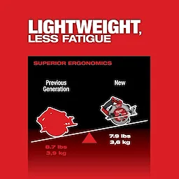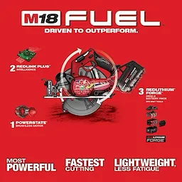Our M18 FUEL™ 7-1/4” Circular Saw is designed for the professional carpenter, remodelers, and general contractors who rely on high-performing and durable tools. Leveraging the latest in cordless technology, this saw offers class-leading performance, providing the power to complete more demanding applications and the cut speed to achieve greater productivity. The POWERSTATE™ Brushless Motor delivers 6,000 RPM, maintaining high speed under load, providing users the ability to complete their most demanding applications efficiently. The latest in REDLINK PLUS™ Electronics ensures maximum tool performance and protection from overload, overheating, and over-discharge. When paired with an M18 REDLITHIUM™ FORGE™ HD12.0 Battery this saw delivers 750 cuts per charge and is fully compatible with all M18 REDLITHIUM™ batteries. The ergonomic, compact, and lightweight design makes the saw a perfect solution for all-day cutting. Positive bevel detents and depth detents offer added productivity and reduce downtime. Additionally, the saw has an electric blade brake, LED work light, rafter hook, and all magnesium guards and shoes, keeping the user productive and providing the durability to handle the toughest job site conditions.