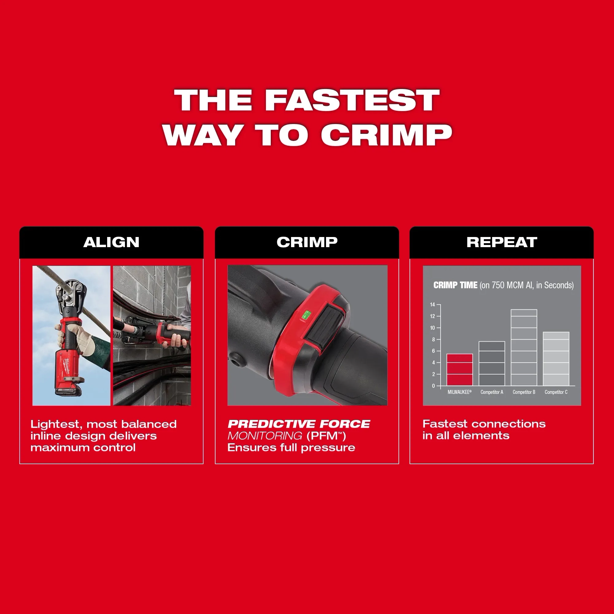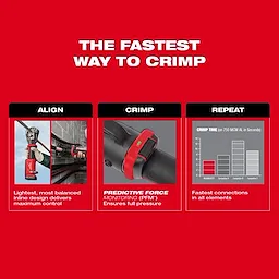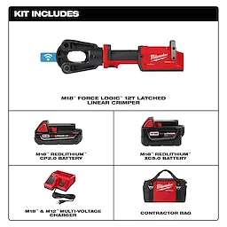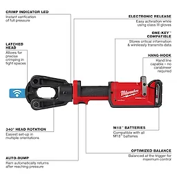 Our M18™ FORCE LOGIC™ 12T Latched Linear Crimper is The Fastest Way To Crimp. Equipped with fully enclosed high-speed hydraulics, a POWERSTATE™ Brushless Motor, REDLINK™ Electronics, and REDLITHIUM™ Batteries, the crimp tool provides the fastest crimp speed and unmatched reliability in the toughest conditions. The linear crimper is designed to allow one-handed use in multiple orientations. An enlarged trigger and electronic release button enable both left and right-handed users to easily activate the tool while wearing Class 3 gloves. The head of the crimper rotates 340° and the quick release and push-to-close style latch pin can be easily opened or secured with just one touch. Predictive Force Monitoring (PFM™) constantly measures output force to deliver the fastest crimp speeds across all connector types and sizes and ensures full pressure is reached every time. A pre-crimp battery check confirms that the battery has enough charge to complete a full crimp. Full compatibility with all industry-standard U-dies allows you to use the dies already on your truck. Our crimper creates UL Classified crimps per UL 486A-B on #8 - 750 MCM Copper and Dual Rated Anderson, Blackburn®, Burndy, Ilsco, Panduit, Penn-Union, and Thomas & Betts color-coded lugs and splices when using our EXACT™ 12T U-Dies. Our crimper is integrated with our ONE KEY™ Technology, giving the crimper the ability to store real-time crimp data.