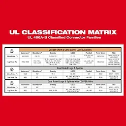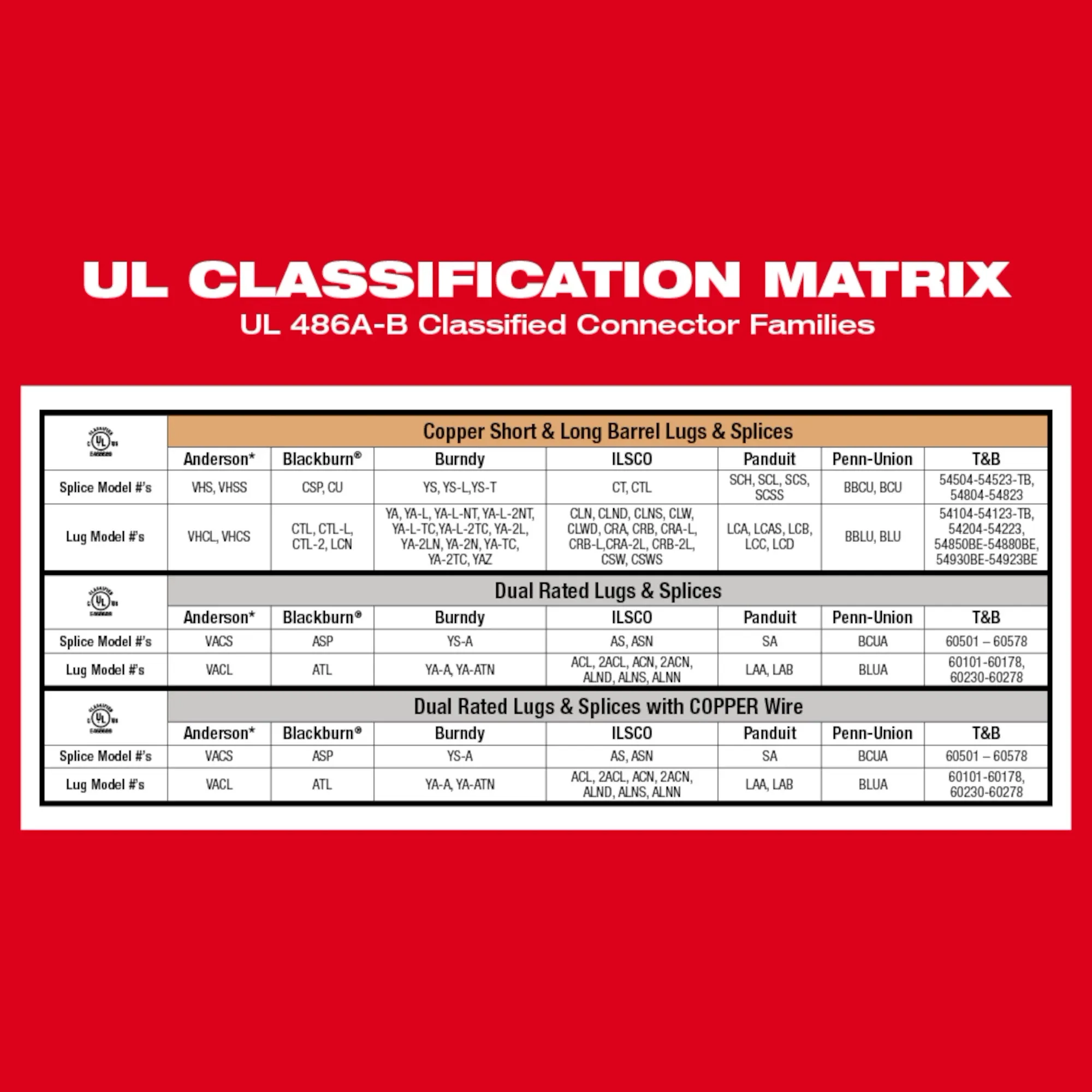 Creates UL Classified crimps under UL 486A-B for #8 – 750 MCM Cu and Dual Rated lugs and splices across several leading manufacturers when used with corresponding Milwaukee® dies