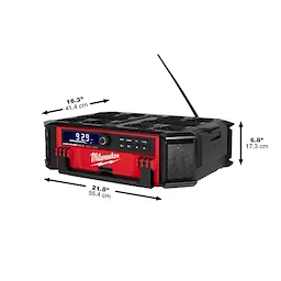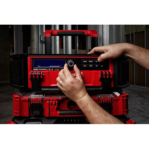Our M18™ Jobsite Radio + Charger w/ PACKOUT™ Compatibility is the ULTIMATE JOBSITE SOUND SYSTEM, fully compatible with all PACKOUT™ storage system solutions. This 10 speaker sound system delivers you with 360° sound. The Milwaukee M18™ jobsite radio delivers full range connectivity with Bluetooth® 4.2, an auxiliary input, and an AM/FM radio. The Bluetooth speaker also features a built-in M18™ charger. This heavy duty jobsite radio has a 2.1AH USB output to keep your M18™ batteries and mobile devices charged all day long.