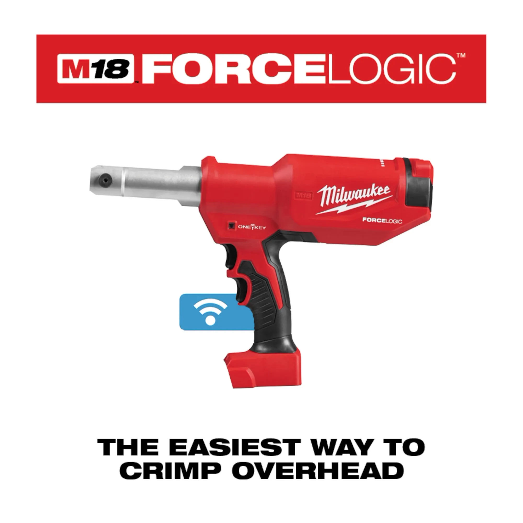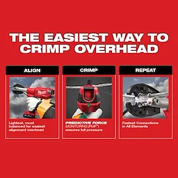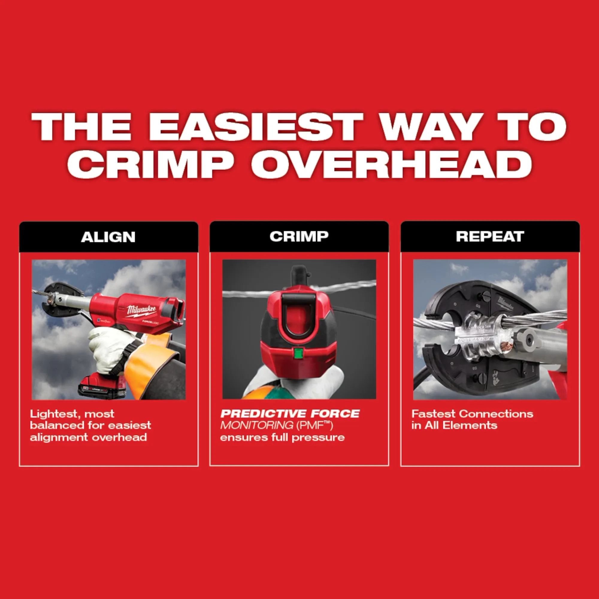 Our M18™ FORCE LOGIC™ 6T Pistol Utility Crimper is The Easiest Way To Crimp Overhead. As the lightest, most balanced 6-ton pistol crimper, it provides linemen the easiest alignment when making connections at shoulder height or above. Predictive Force Monitoring (PFM™) constantly measures force output, delivering the fastest crimp speed while providing accurate pressure and instant verification every time. A 340° rotating head allows for easy access into tight spaces. Compatible with eight crimping and cutting jaws, the crimper delivers the versatility to tackle a variety of applications. With the ability to crimp up to 4/0 line taps and cut up to 750MCM Cu, 1000MCM Al, 477 ACSR, ½” EHS Guy Wire, 3/8” Rebar, and 3/8” Ground Rod by simply changing jaws, the crimper becomes a lineman’s single crimping and cutting solution. With our ONE-KEY™ Technology, MILWAUKEE® Crimpers enable you to store real-time crimp data, generate professional reports, view historical tool performance data, and sync it all wirelessly to the cloud for easy access. The 6T pistol grip cordless crimper features a POWERSTATE™ Brushless Motor, REDLINK™ Electronics, and REDLITHIUM™ Batteries, providing you with unmatched reliability in the toughest conditions. In addition to the cordless 6T Pistol Utility Crimper, the kit includes an M18™ 6T Fixed BG Crimping Jaw, two M18™ REDLITHIUM™ CP2.0 Batteries, an M18™ & M12™ Multi-Voltage Charger, and a contractor bag.