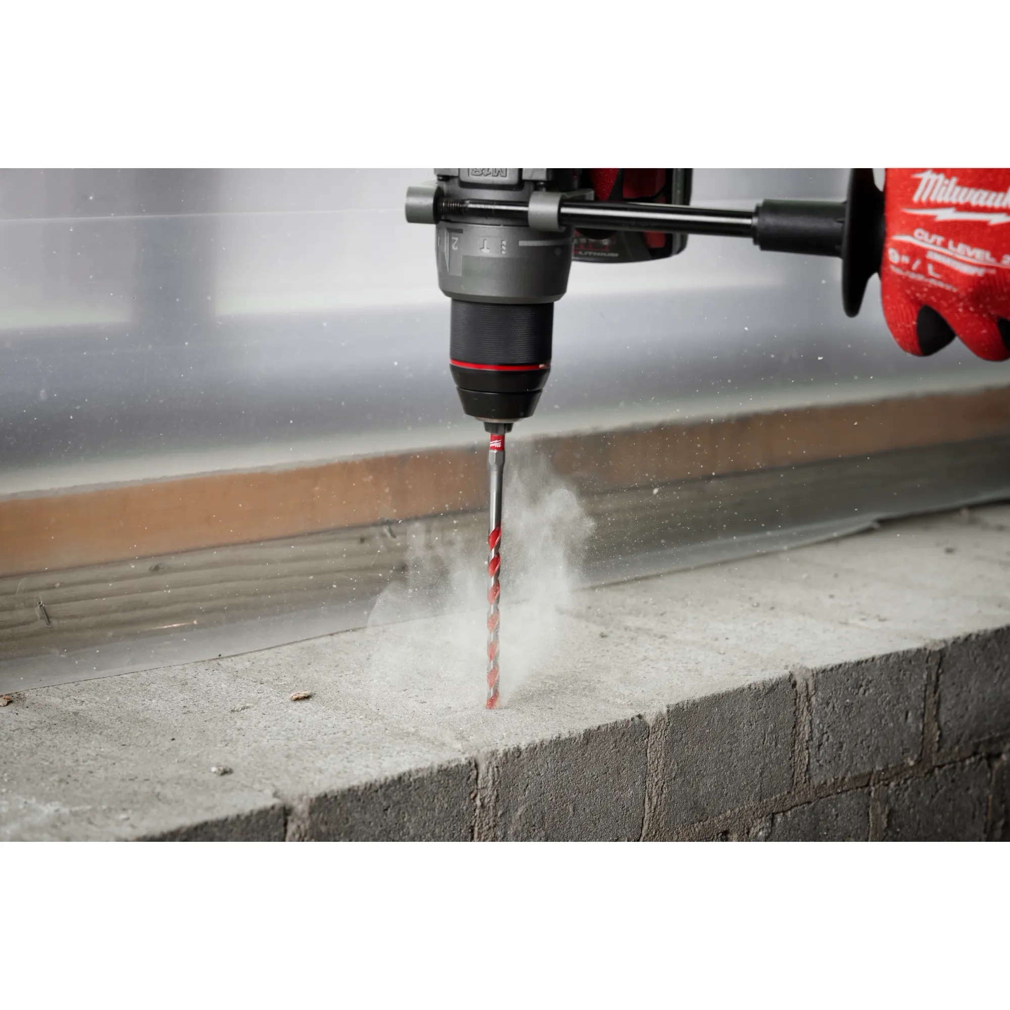 Our SHOCKWAVE Impact Duty™ Carbide Hammer Drill Bits are designed with sharpened carbide to deliver up to 9x longer life and 4x faster drilling into concrete. The POWER TIP™, available in sizes 3/8" and above, is designed with dynamic cutting edges and a chip breaker for increased productivity and easier drilling from start to finish. Engineered with precision ground carbide, these bits deliver faster starts and less walking in concrete, brick, and block. Wide flute design removes dust faster, reducing heat and delivering more holes per charge. Equipped with a ¼” Hex Shank, Milwaukee® SHOCKWAVE Impact Duty™ Carbide Hammer Drill Bits are the ideal solution for drilling in masonry materials with both impacts and hammer drills/drivers.