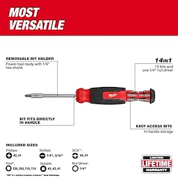 Includes: P1, P2, SL 1/4", SL 3/16", SQ1, SQ2, SQ3, ECX1, ECX2, T10, T15, T20, T25 and 1/4" nut driver