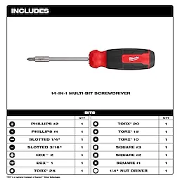 - 13 bits and one nut driver: #1 Phillips, #2 Phillips, 1/4" Slotted, 3/16" Slotted, ECX 1, ECX 2, TORX® 25, TORX® 20, TORX® 15, TORX® 10, #1 Square, #2 Square, #3 Square, and 1/4" Nut Driver