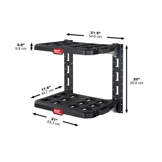 Our PACKOUT™ Racking Kit includes two PACKOUT™ racking shelves and two 20” lengths of E-Track that allow you to attach and mount your racking system to a wide variety of surfaces: including your vans, trucks, trailers, garages, and shops. Featuring a metal reinforced frame and impact-resistant body, these tool storage racks have a 50lbs weight capacity per shelf and allow you to customize and build a PACKOUT™ System that fits your needs. This Racking Kit is part of the MILWAUKEE® PACKOUT™ Modular Storage System, the industry's most durable and versatile storage system.