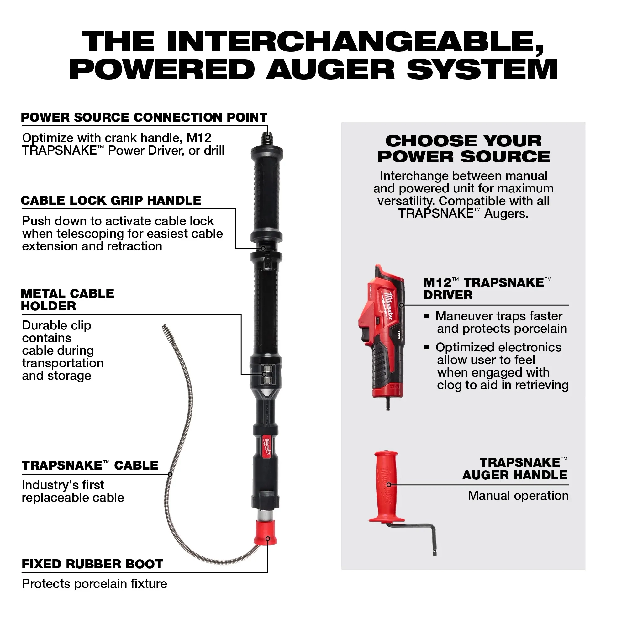 The TRAPSNAKE™ System allows for a dedicated power source to clear clogs in toilets, urinals, floor traps, sinks, bathtubs, and showers.