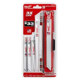 Our 10 piece SAWZALL® blade set features an assortment of standard wood and metal cutting reciprocating saw blades for a broad range of professional applications. The set includes two 6" wood cutting blades for increased control and one 9" wood cutting blade for greater cutting capacity. NAIL GUARD™ protects your blade's teeth from fracturing during cutting while the FANG TIP™ feature allows you to easily perform plunge cuts. The blade set also includes three 6" 14TPI blades for medium to thick metal cutting, three 6" 24 TPI blades for thin metal cutting, and one 9" 18 TPI blade for medium metal cutting. The metal cutting blades feature TOUGH NECK™ ribs that strengthen your blade's tang and minimize breakage. In addition to the 10 recip saw blades, the SAWZALL® blade set includes a durable case allowing you to conveniently store the blades while on the jobsite.