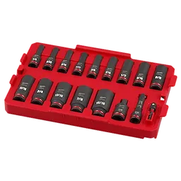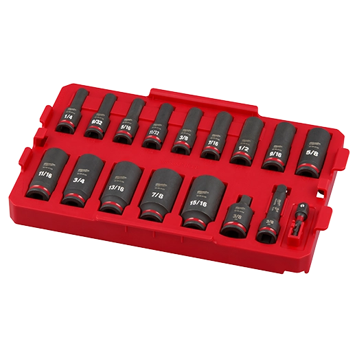 Our SHOCKWAVE Impact Duty™ Socket Set features the boldest, longest-lasting markings and extreme impact durability in high torque applications. The stamped and ink-filled size marking enables you to select the right socket every time throughout the life of the socket. Engineered with high-strength forged steel for optimized performance in heavy-duty applications. Our sets feature removable trays that are compatible with our PACKOUT™ Organizers and fit in tool chest drawers. The non-slip hex geometry prevents fastener rounding. Our dual-hole design and ring groove allow for easy socket attachment and removal. All SHOCKWAVE Impact Duty ™ Sockets and Extensions are backed by our Lifetime Guarantee and meet ASME industry standards.