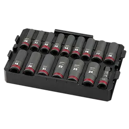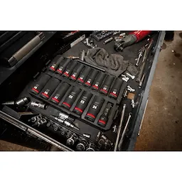 Our SHOCKWAVE Impact Duty™ Socket Set features the boldest, longest lasting markings and extreme impact durability in high torque applications. The stamped and ink filled size marking enables you to select the right socket every time throughout the life of the socket. Engineered with high strength forged steel for optimized performance in heavy duty applications. Our sets feature removable trays that are compatible with our PACKOUT™ Organizers and fit in tool chest drawers. The non-slip hex geometry prevents fastener rounding. Our dual hole design and ring groove allows for easy socket attachment and removal. All SHOCKWAVE Impact Duty ™ Sockets and Extensions are backed by our Lifetime Guarantee and meet ASME industry standards.