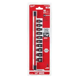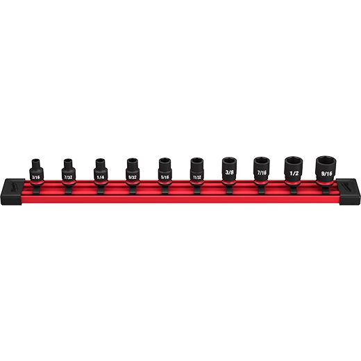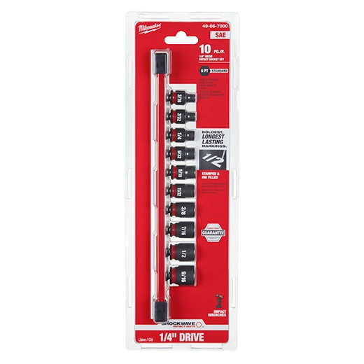 Our SHOCKWAVE Impact Duty™ 1/4" Drive 6 Point Socket Sets feature the boldest, longest-lasting markings and extreme impact durability in high torque applications. The stamped and ink-filled size marking enables you to select the right socket every time throughout the life of the socket. These sockets are engineered with high-strength forged steel for optimized performance in heavy-duty applications. The non-slip hex geometry prevents fastener rounding, and a dual-hole design and ring groove allow for easy socket attachment and removal. The customizable Socket Rail comes with removable end caps to add or take off socket clips for optimal storage. All MILWAUKEE® SHOCKWAVE Impact Duty™ Sockets are backed by a Lifetime Guarantee and meet ASME industry standards.