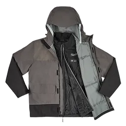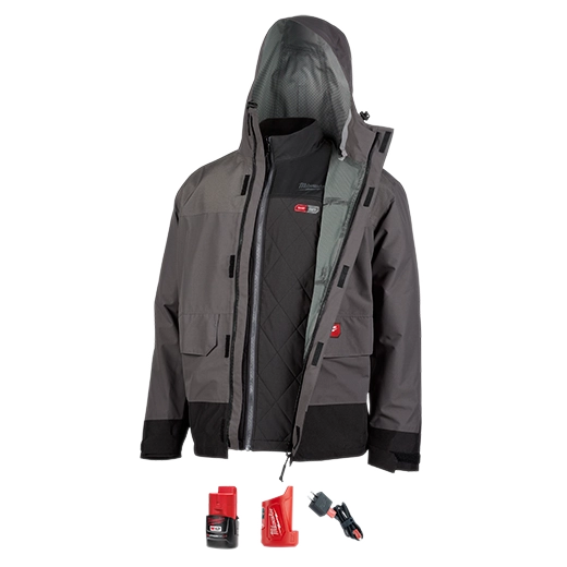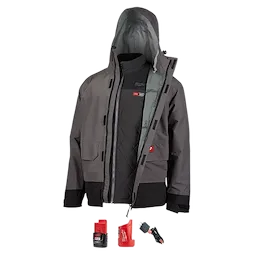Our M12™ Heated AXIS™ Layering System with HYDROBREAK™ Rain Shells are designed to protect you from the cold and rainy weather conditions on the job site. Powered by M12™ REDLITHIUM™ Battery Technology, the AXIS™ heated work jackets use carbon fiber heating elements to create and distribute heat to the chest, back and shoulders. A one-touch LED controller heats up the battery heated jacket to three heat settings, creating a comfortable heat for any environment or weather. This MILWAUKEE® heated jacket has a new Quick-Heat function that allows you to feel heat three times faster than our previous jackets and market competitors. Like all of our other products, our jackets are built strong to last long with new AXIS™ Ripstop Polyester providing a lightweight, compressible design that can be used as an inner layer or mid-layer jacket and protects you from wind and water resistance to survive the elements. The HYDROBREAK™ Rain Shell combats against ran and snow conditions. The 2.5 layer rain shell is designed with ripstop polyester for tear and abrasion resistance and a polyurethane laminate to keep you dry all day. The heated coats are available in gray with sizes ranging from small to 3XL. These come with the M12™ battery heated jacket and HYDROBREAK™ rain shell, one M12™ REDLITHIUM™ CP2.0 battery, and an M12™ compact charger and power source.